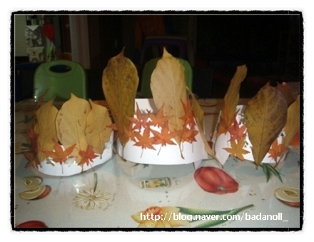 두꺼운 종이에 양면 테잎을 붙이고 낙엽으로 장식.